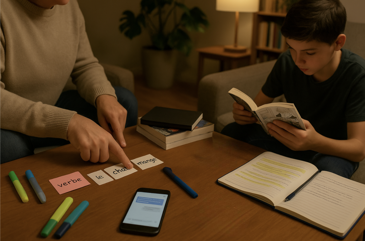 - Faire de la grammaire un jeu de construction. Oubliez le par cœur. L’idée est de lui faire manipuler la langue. Jouez à trouver le verbe et son sujet dans des phrases complexes. Utilisez des surligneurs de couleurs différentes. Montrez-lui que la phrase est un puzzle logique. L’objectif : passer de « je dois appliquer une règle » à « je comprends comment ça fonctionne ».